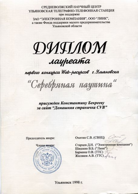 | Диплом | Лауреат первого конкурса Web-ресурсов г. Ульяновска «Серебряная паутина» | Жюри конкурса | 1998 |